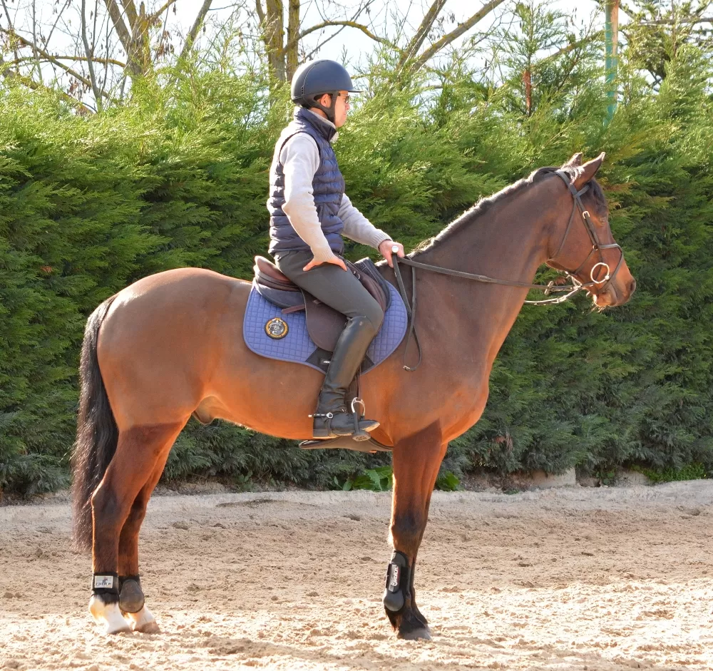 D’un bon niveau technique sur le plat comme à l’obstacle, il présente une bonne aptitude pour du dressage avec de jolis allures régulières. Attention toutefois, il possède du sang et à un peu de force. Il lui est préférable donc d’avoir un cavalier à minima expérimenté (supérieur au galop 4). D’un tempérament émotif en concours (sorties en Cycle libre et amateur), il n’en est rien à la maison. Cela fait de lui le compagnon idéal pour évoluer et passer ses galops 5, 6, 7.